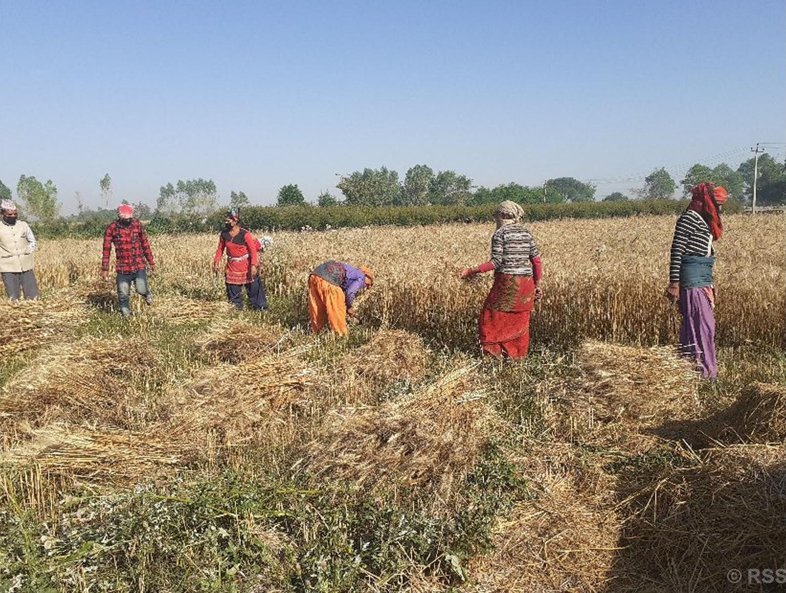 दैलेख । कोरोना संक्रमणबाट बच्न स्थानीय सरकारले सचेतना अभियान तीव्र पारेसँगै खेतबारीमा किसानले दूरी कायम गरेर बाली काट्न थालेका छन् । गहुँबाली बारीमै झर्न थालेपछि राकम कर्णालीका किसान गहुँ काट्न